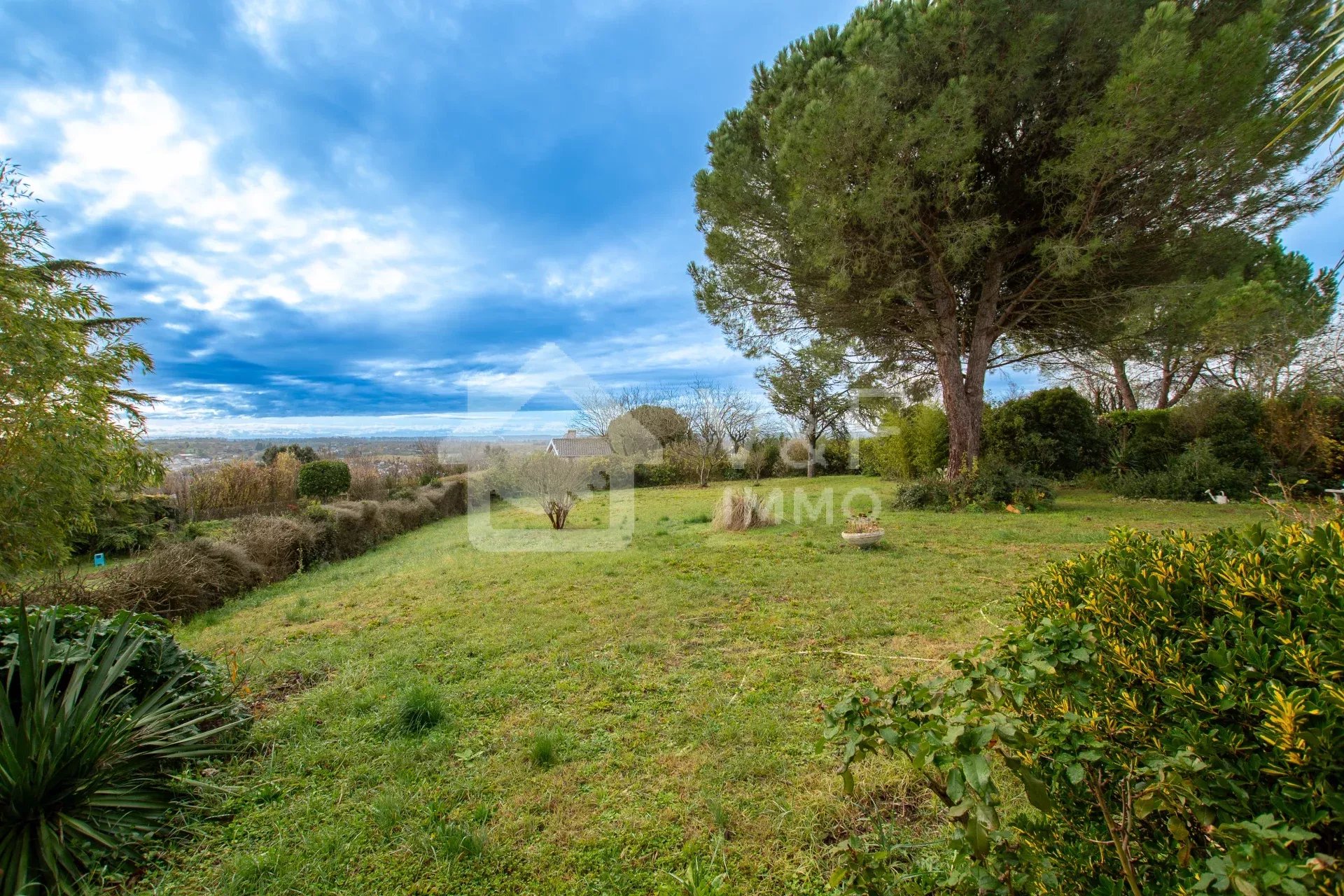 Extérieur agréable avec terrain arboré, terrasse et vue dégagée sur les Pyrénées.